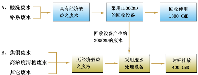 電鍍綜合排放廢水回用係統工藝流程示意圖如下: